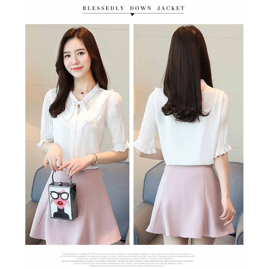 2018 Pakaian Musim Panas Model Baru Gaya Korea Bersablon Lengan Terompet Kemeja Sifon Lengan Pendek Atasan Pinggir Daun Teratai Kemeja Kecil