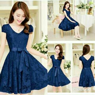 Dress Brukat Anggun Biru Dongker Terusan Pesta Blue Navy Natal Tahun Baru Imlek Wanita Cantik Pita