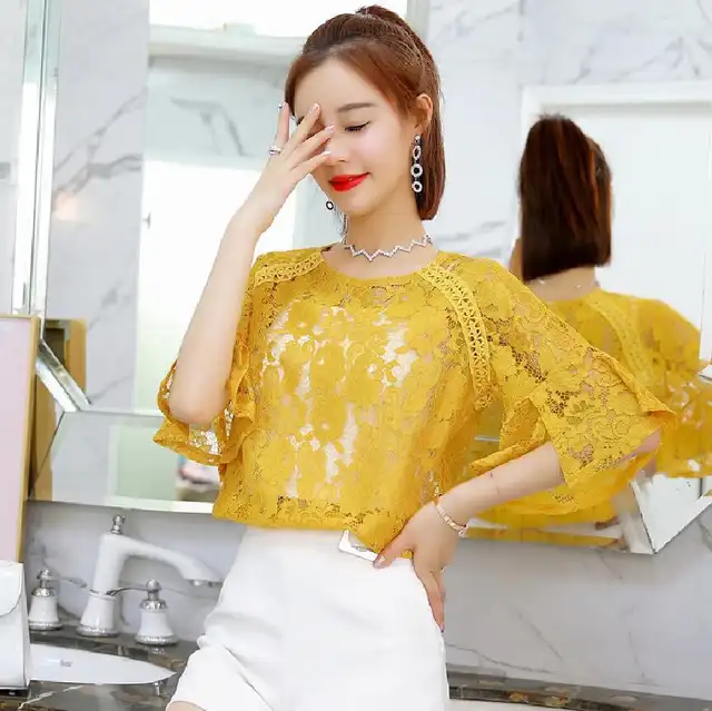 Jual Super Elegan Kemeja Renda Lengan Pendek Wanita 2018 Model Baru